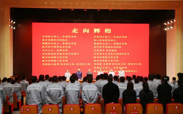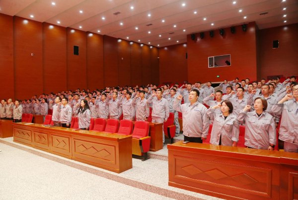 会议开始,全体参会人员起立宣誓,铮铮誓言凝聚起奋进力量。随后,潞宝集团《与爱同行30年》与普能公司《公司介绍》宣传片相继播放,既展现了企业辉煌发展的底蕴,也激发了全员团结奋进的豪情。